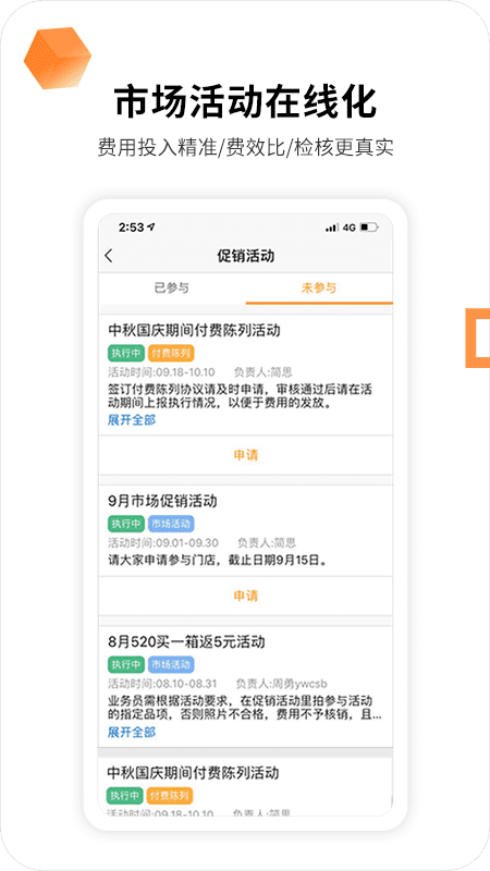 活动场景:支持对AP、CP费用从预算到申请到上报到核销的精细化闭环管理。