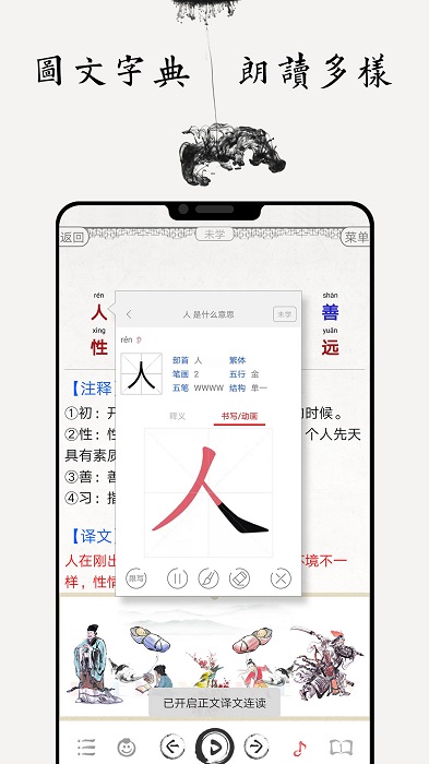 5、【音频】软件解锁后大部分正文配儿童/男声/女声朗读、有词典、汉字点读和书写动画、译文配语音。