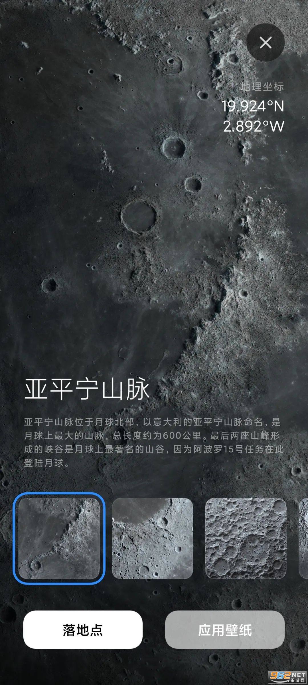 「月球系列」超级壁纸一共包含5个落脚点:亚平宁山脉、广寒宫、月球背面、嫦娥五号、静海基地。