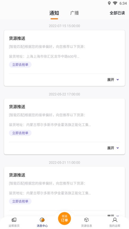 2、整合全国范围货源信息网络,涵盖专线货源与全国货源等多种类型,满足不同司机的业务需求。