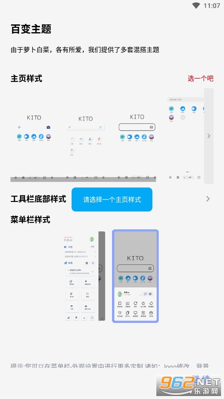 现在打开可拓浏览器,可以选择自己喜欢的主题了,软件主要的设计风格是“新拟态样式”,这类样式在之前流行过一段时间,但是没有火起来,可拓浏览器可以选择五种主页的样式,六种工具底部栏的样式、两种菜单栏的样式,如果这还不够,也可以在设置进行更多的定制。