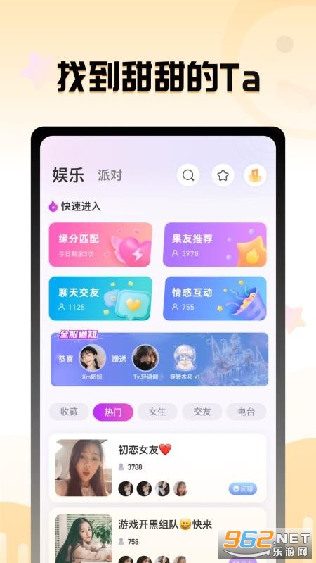 果甜是一款专注于为用户提供真实交友体验的社交平台。用户可以根据个人喜好和需求,寻找与自己志同道合的朋友或恋人。无论是寻找共同兴趣爱好的伙伴,还是寻求浪漫爱情,果甜都能满足您的需求。通过筛选机制和个性化推荐,帮助用户更快地找到心仪的对象。果甜致力于打造一个安全、真实、舒适的社交环境,让用户能够放心地展示自己,并结识到对自己有意义的人。