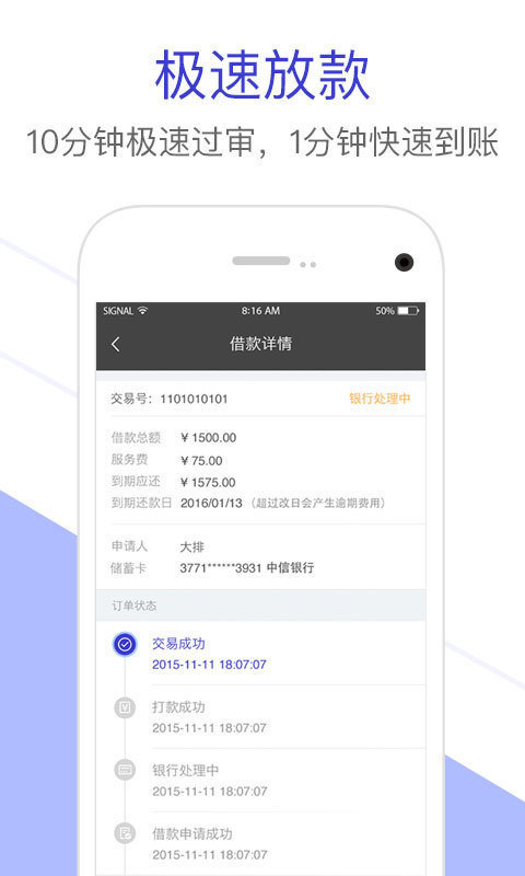 1、借款最快3分钟就能完成贷款,获得平台的打款。
