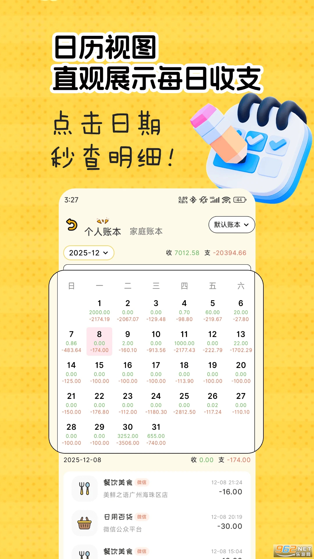 5、以简洁的日历展示的方式让用户查看每日、每月的开销,方便用户日后根据日期进行随时查看;