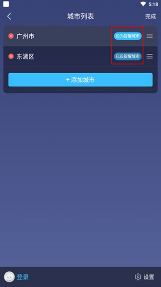 4、在城市列表页选择编辑可以设置需要主动提醒的城市