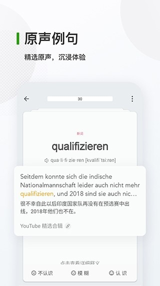 收录《每日德语听力》中的海量原声例句,内容出自你喜欢的电影、美剧,或是专业新闻和考试真题,助你了解单词的真实语境,专业高效地记忆单词。