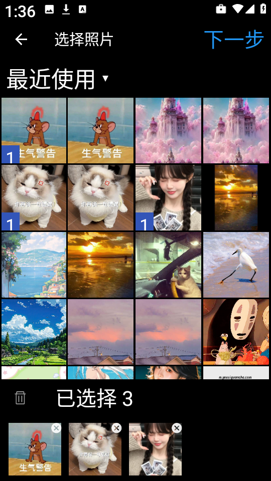 4、从手机相册中选择你喜欢的图片,选好后点击下一步”继续编辑。
