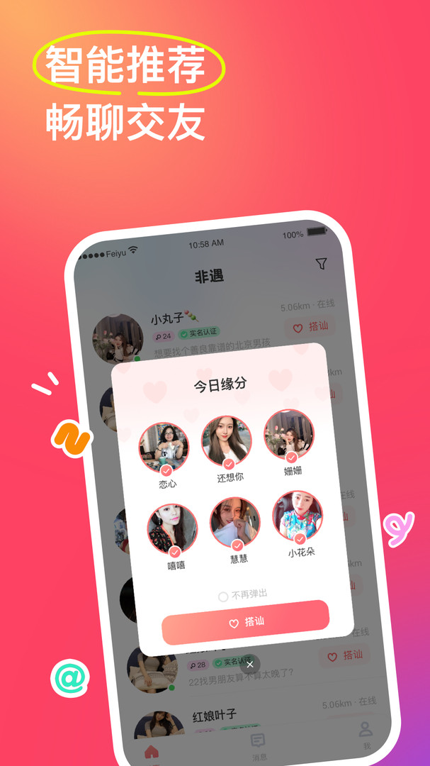 非遇是一款深广大用户欢迎的聊天交友软件,深受大家的欢迎。在非遇app中用户都是经过真人实名认证,用户可以在这里快速的匹配到同城的异性好友,为自己喜欢的异性送上礼物,即刻开启甜蜜互聊,感兴趣的朋友快来下载体验吧。