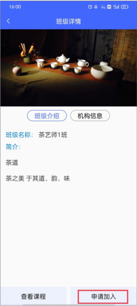 2、查看课程详情,了解班级和机构信息,点击右下角的申请加入。
