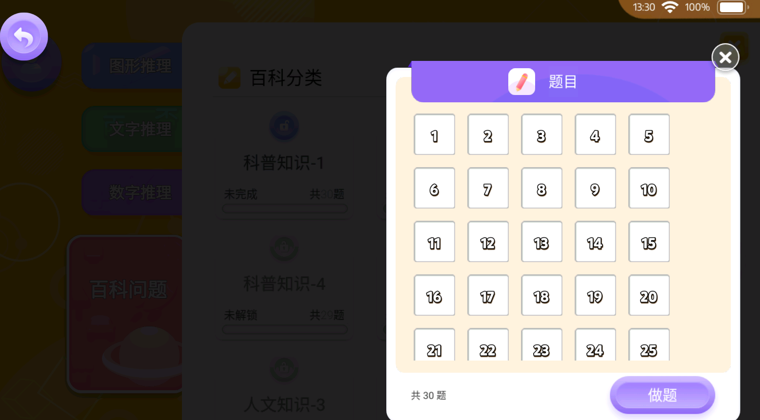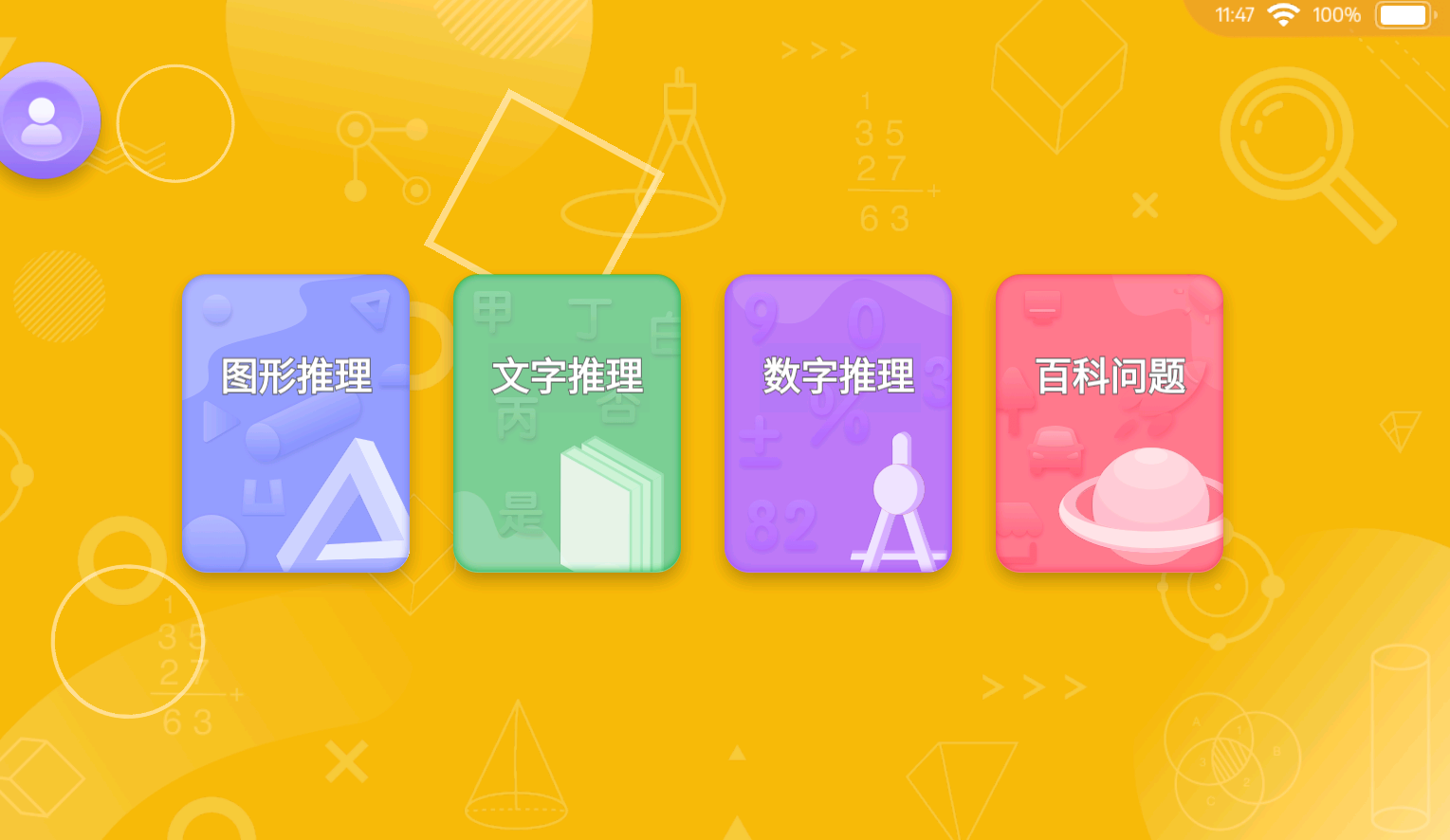2、进入页面,涵盖了图形推理、文字推理、数字推理和百科推理。