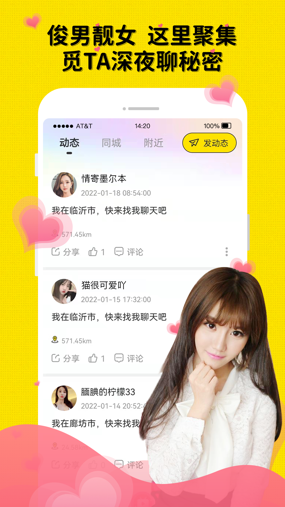 1、附近交友—发现同城用户,参与线下活动,打破虚拟界限,在现实中遇见心动对象,构建真实社交场景。