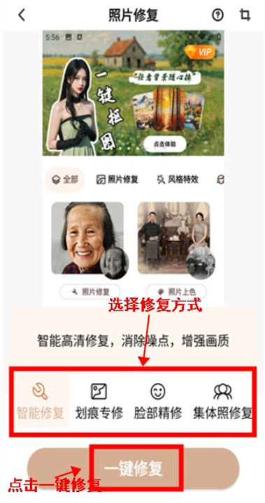 4、最后根据需求选择智能修复、划痕专修或脸部精修等功能,一键完成修复过程。