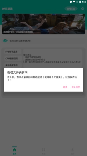 1、下载安装好帧率显示器软件后,先给app悬浮框的权限。