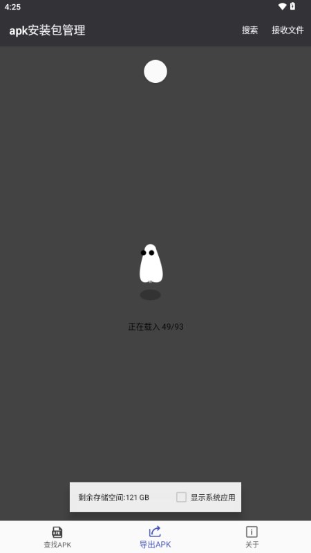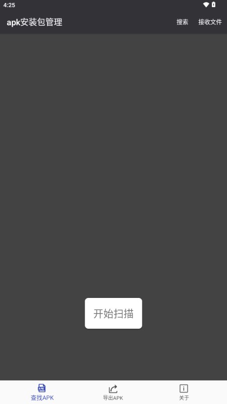 1、下载进入apk安装包管理app,在下方你可以看到查找apk、导出apk、关于三个板块,找到你手机里没有的安装包。