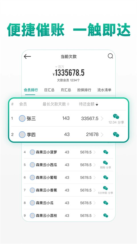 3、赊账管理,直观清晰:赊账记录清晰,多种方式催收便利,在线还款操作简单,账期、欠款额度可灵活设置