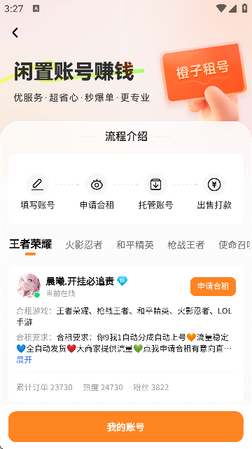 橙子租号是帮忙用户提供游戏账号租赁买卖的软件。各种类型的游戏账号这里全部都要,一般都是比较常见的游戏账号,用户之间可以直接交流买卖租赁,所有信息都是真实的,所有用户在进行交易的时候都是经过认证的。收益可以直接在APP里面看到,每一笔账单都是比较清晰的,用户可以将闲置的账号交易,提升等级的同时又可以获得零花钱,有兴趣的用户可以下载试试看!