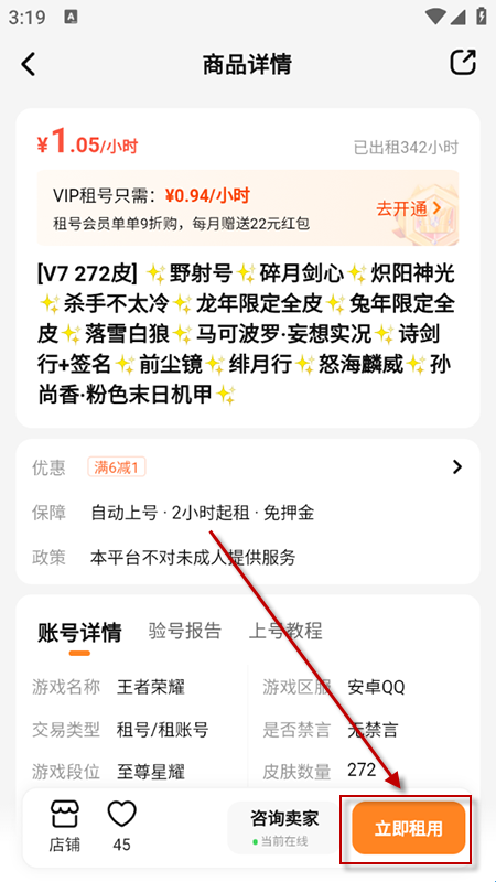 2、租赁账号,在首页选择游戏,进入账号列表,筛选条件,浏览账号详情与截图,选择租期,点击“立即租用”。