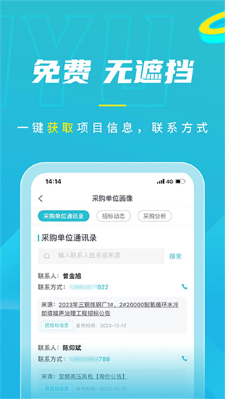 4.招标信息搜索:全国招标采购信息不限量查看,不遮挡任何内容,2265项目联系人和电话全部显示,让你直接高效沟通.