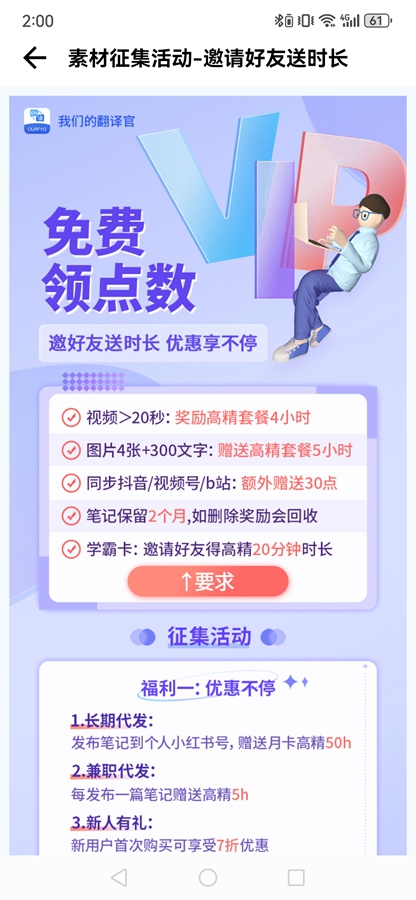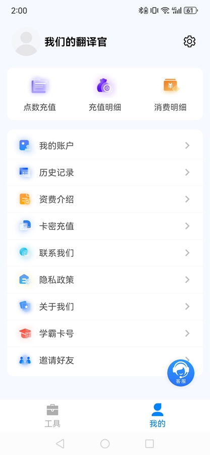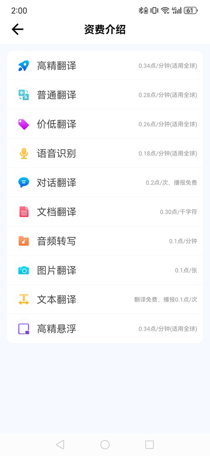 我们的翻译官app花费的是点数,点数可以做任务或者充值购买,具体花费多少需要看你用的什么功能,不同功能点数消耗不同