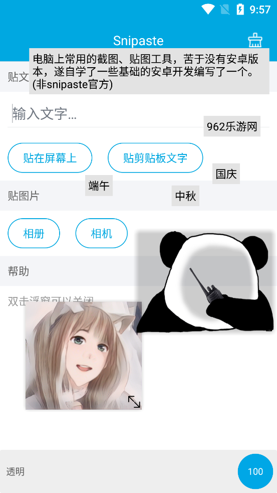 电脑上常用的截图、贴图工具,苦于没有安卓版本,遂自学了一些基础的安卓开发编写了一个。(非snipaste官方)