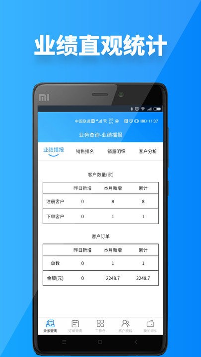 2、业绩统计,相关的业绩都会得到统计,能随时查看自己的业绩变化和内容信息