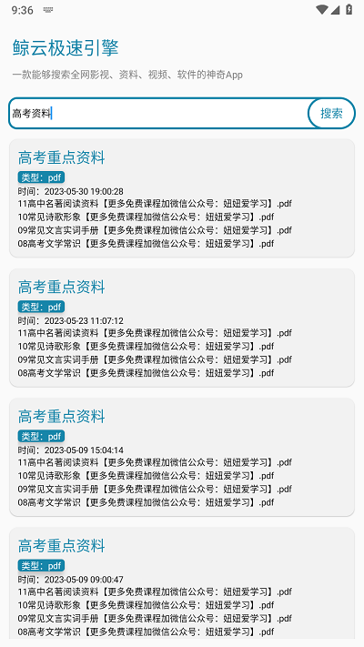 集资源搜索、资源分享、资源管理于一体的综合APP,是一款免费的移动资源搜索器,可以搜索全网各种资源,包括电影、音乐、图片、软件、小说、游戏等,还可以通过资源的分享功能分享下载链接和文件到社交平台。