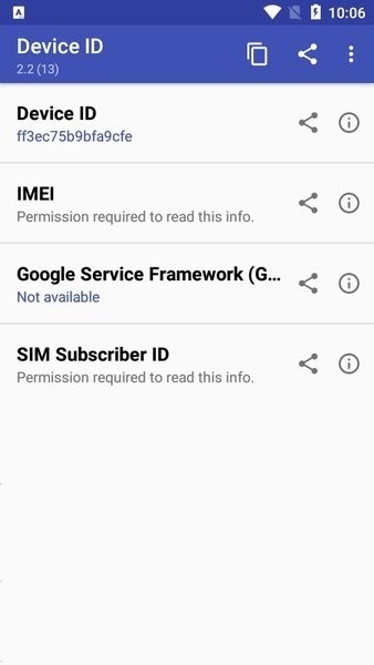 3. 全面信息展示:device id能够展示设备的多种信息,包括但不限于设备名称、厂商名称、硬件名称、Android ID、IMEI/MEID、Subscriber ID(IMSI)、SIM卡序列号、WiFi MAC地址、以太网MAC地址以及蓝牙MAC地址等。