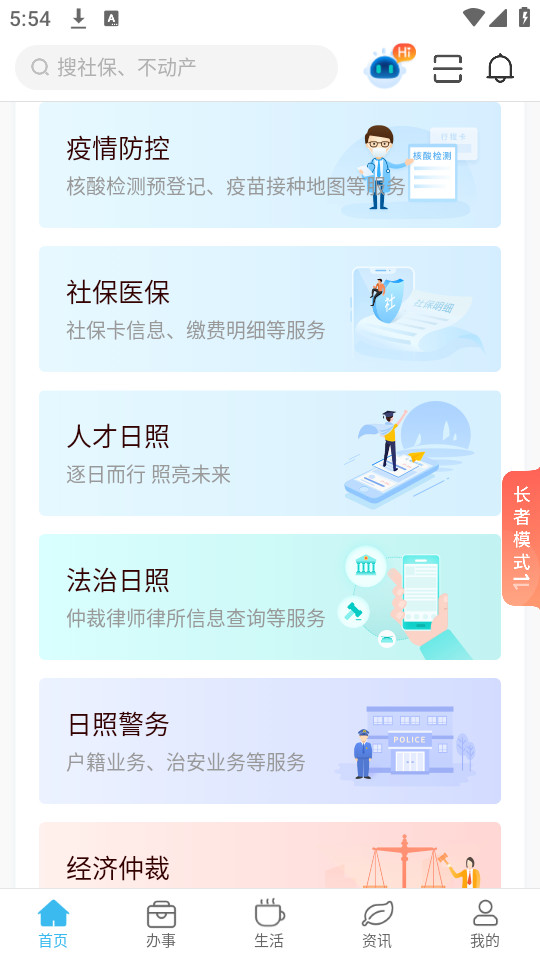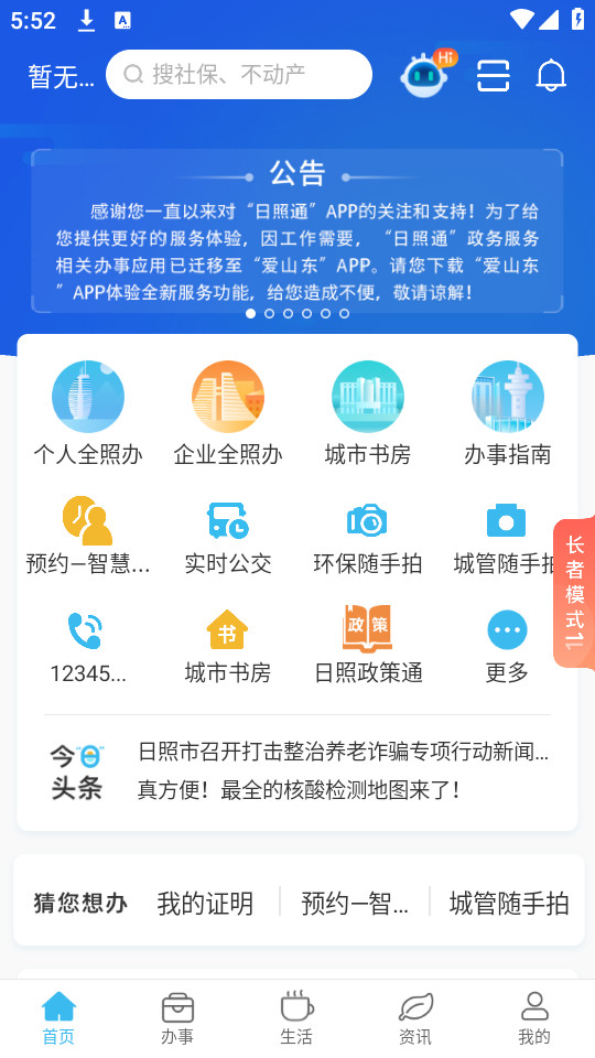 1.下载安装并打开日照通app,赋予权限,进入首页之后点击【办事】