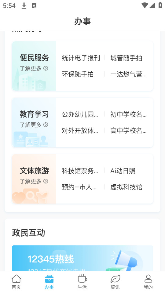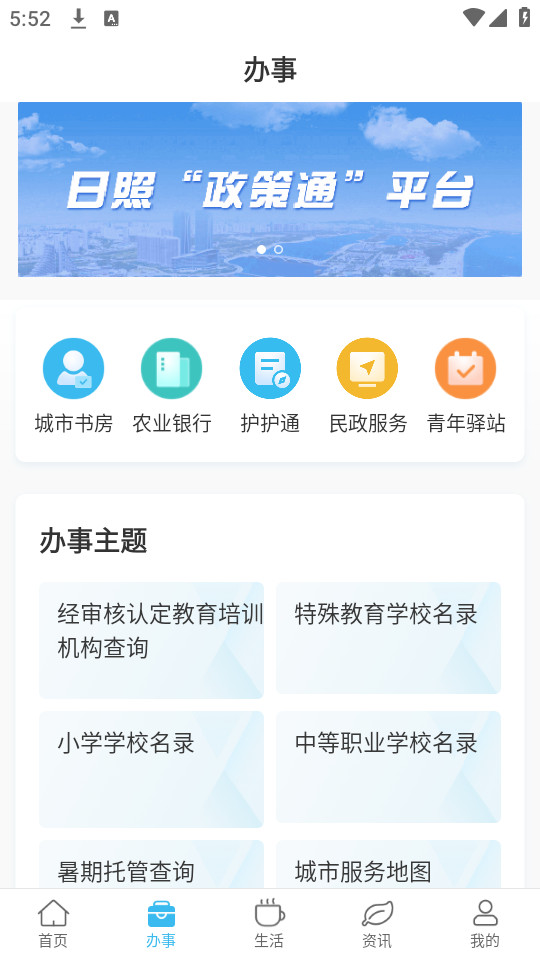 4.【办事】为市民提供“一网通办”服务,市民可根据办事主题,快速获取所需的办事事项,根据办事指南,进行在线办理。