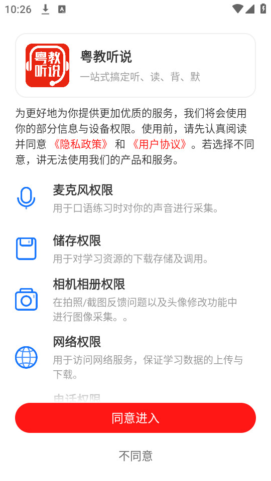 下载安装并打开粤教听说app,点击同意进入,同意隐私政策