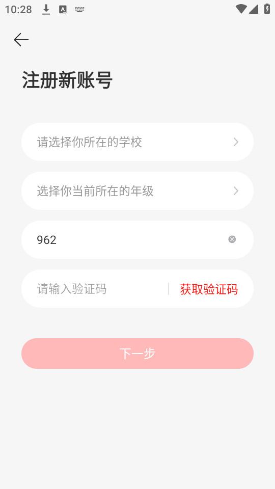 输入学校、年级、手机号以及验证码,点击下一步完成注册