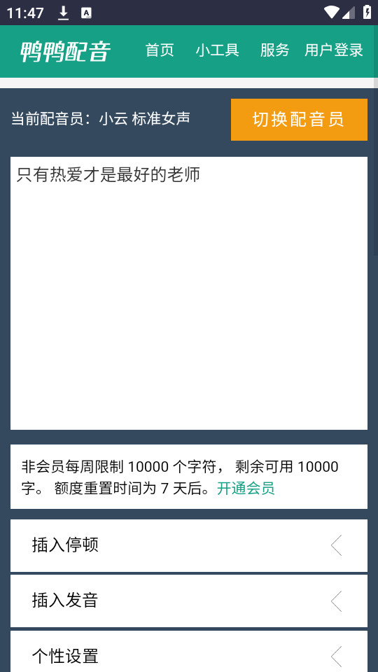 1、免费配音服务:用户可以享受高达10,000字的免费配音服务,这对于需要大规模文本转语音的用户来说无疑是一个巨大的优势。无需额外费用,用户便可以进行各种配音项目,极大地提升了配音的可及性和便利性。
