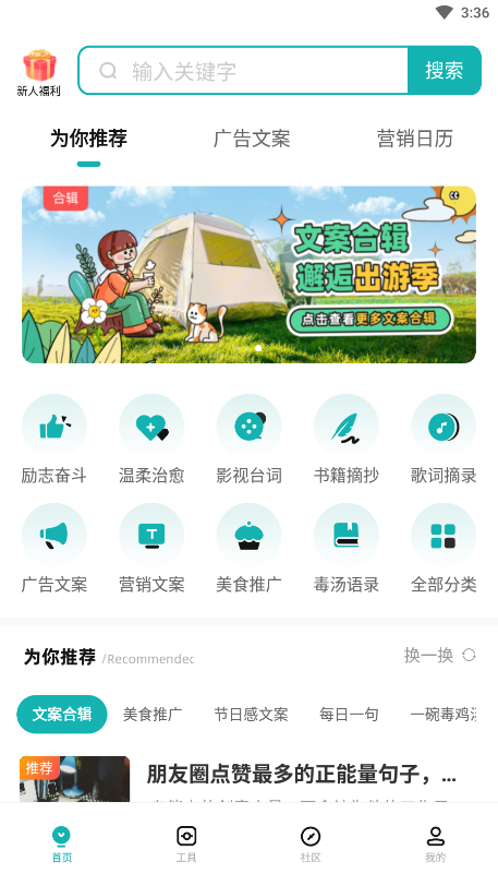 4、除了可以寻找文案,还可以在这里展现自己的才华,上传自己觉得写的好的配文;