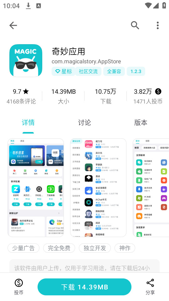 一款集合了众多有趣且实用的应用程序的移动应用。提供了各种各样的小工具和应用程序,涵盖了很多领域,如健身、摄影、游戏、音乐、学习等等。用户可以通过奇妙应用轻松地找到自己需要的应用程序,并下载到自己的手机上。软件会上线很多玩家用户自制的软件,用起来很简单方便。快来下载吧!