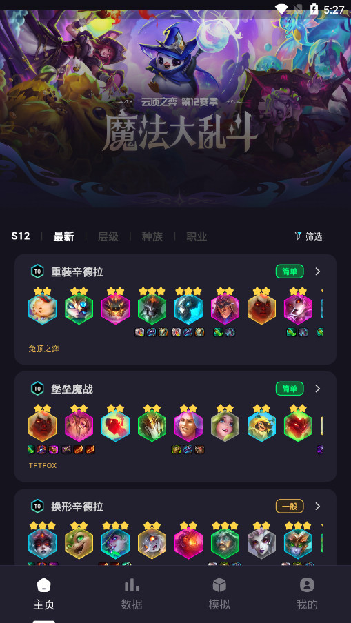 1、打开tftfox弈狐助手免费版软件【主页】,可以看到S12最新赛季的数据总览,包括了各个阵容体系层级的强弱程度,以及一些比较流行的上分搭配组合。