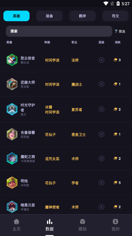 2、【数据】中则是包含了现有所有棋盘英雄的属性成长值,以及升级所需要花费的金币数量。