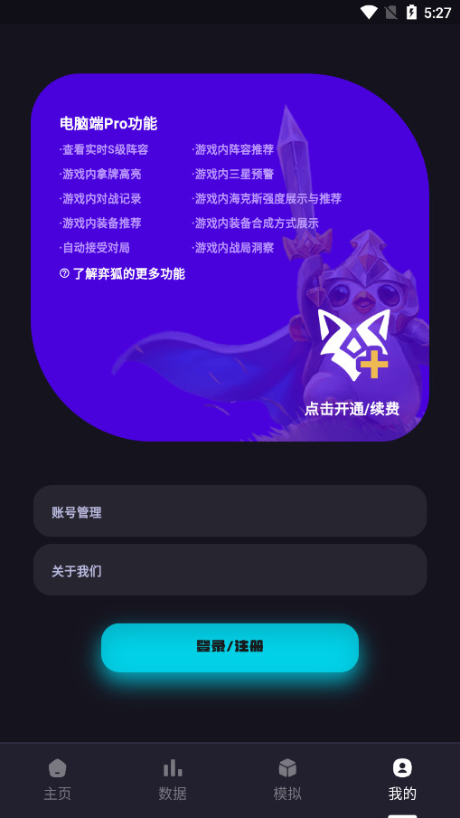 4、当你需要绑定多个账号,或是需要使用一些深入的辅助功能,就需要用到【我的】,在这里完成登录注册账号绑定,方便你的游戏数据随时管理。