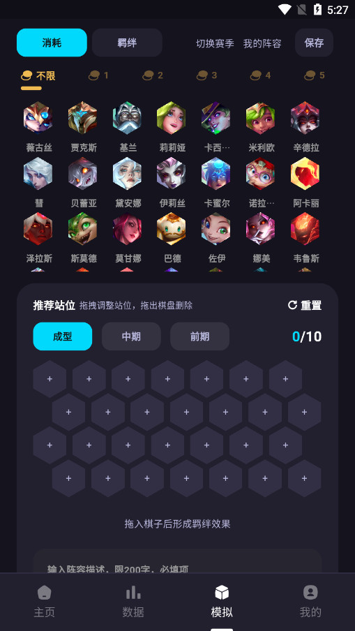 3、在【模拟】功能栏内,则是主要针对棋盘对应的变化来进行了深度复盘,一些英雄的站位都有详细的说明介绍,让大家在次就能够模拟真实的对局。