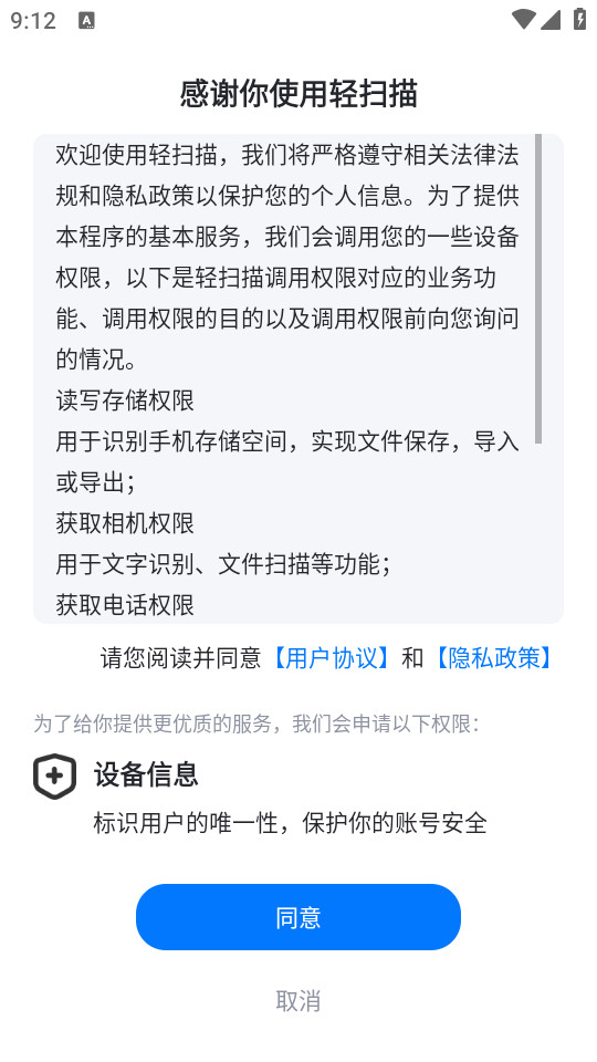 下载安装并打开轻扫描app,点击同意,同意隐私政策