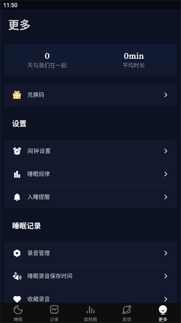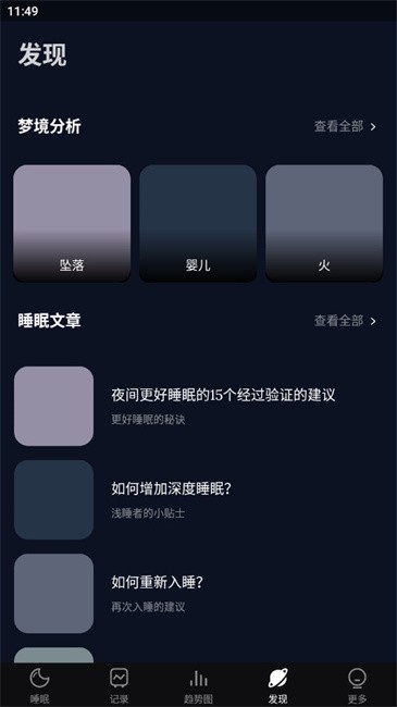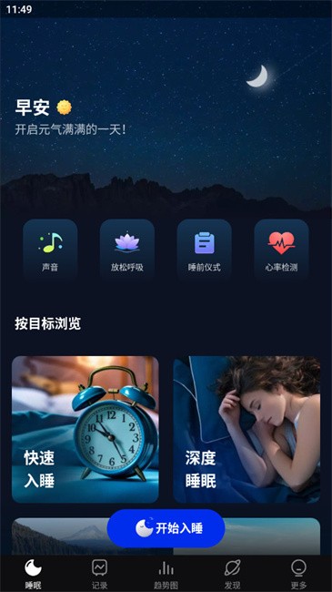1.进入主页,用户可在首页设置就寝时间和闹钟,点击发现。