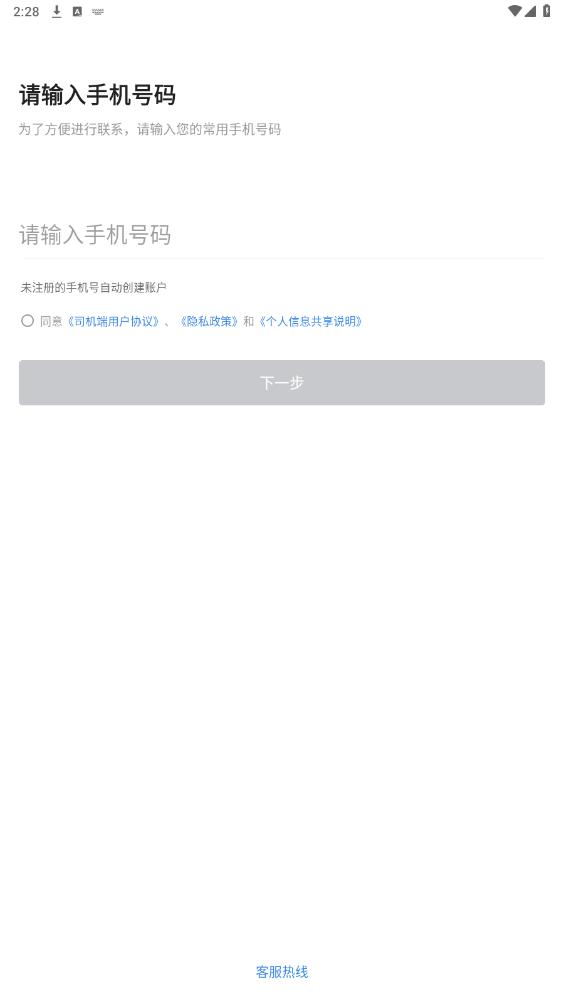 打开飞嘀世纪app,输入手机号,勾选相关协议,点击下一步