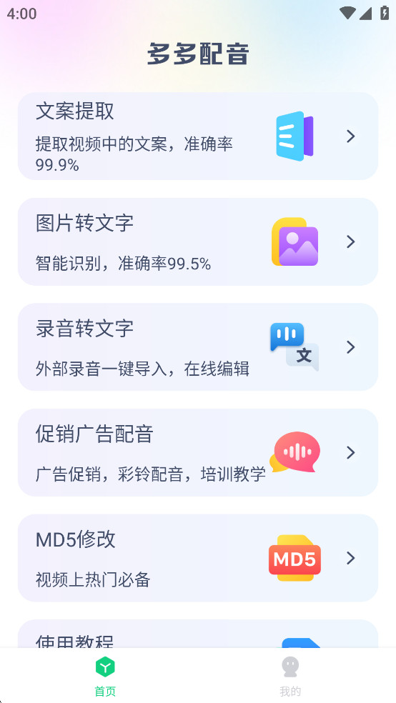 多多配音app是一款功能强大、操作简便的智能语音合成软件。它凭借MD5修改和文案提取等独特功能,为短视频创作者和自媒体人提供了便捷、高效的解决方案。无论你是想要制作个性化的配音作品,还是需要提取视频中的文案进行创作,多多配音app都能满足你的需求。