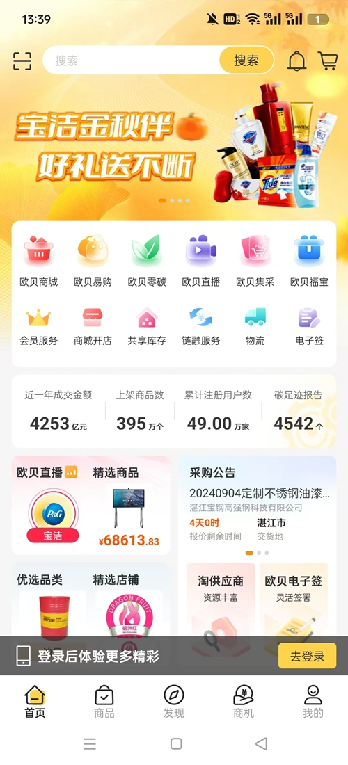 1、下载欧贝工业品采购平台打开,找到首页下方的【登录】。