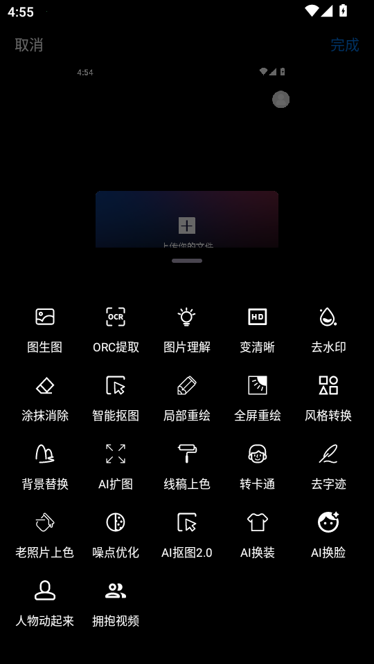 4、以图片为例,选择图片后软件会给出多种操作,如图生图、图片理解、抠图、重绘等等,视频和文档有不一样的功能,大家可以试试。