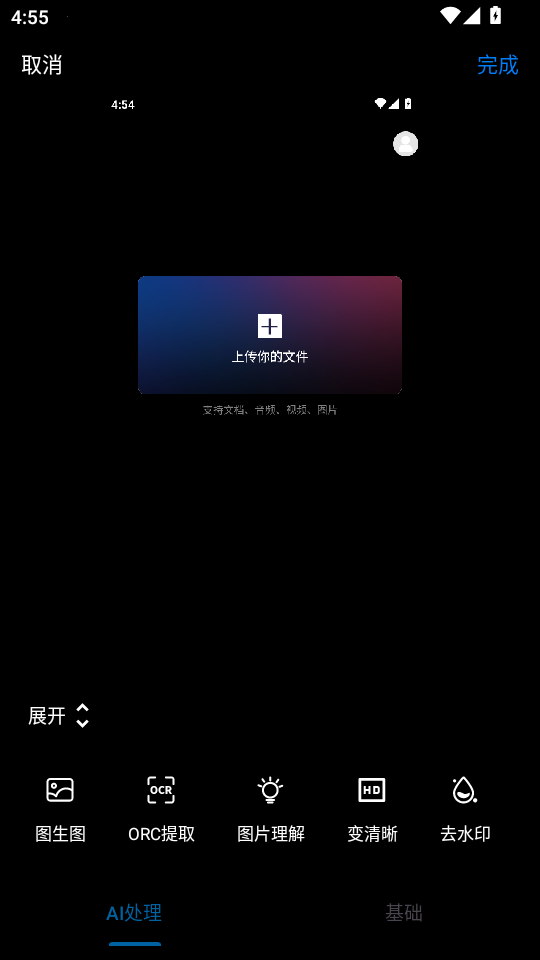 3、回到主页可以选择照片、视频、文档、音频等,进行ai处理