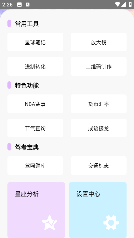 1、进入软件后,可以看到各种实用工具和特色功能,点击下方星座分析