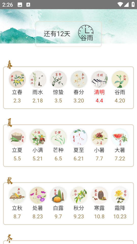 3、在节气工具里面可以看到一年二十四个节气的时间,以及节气知识等