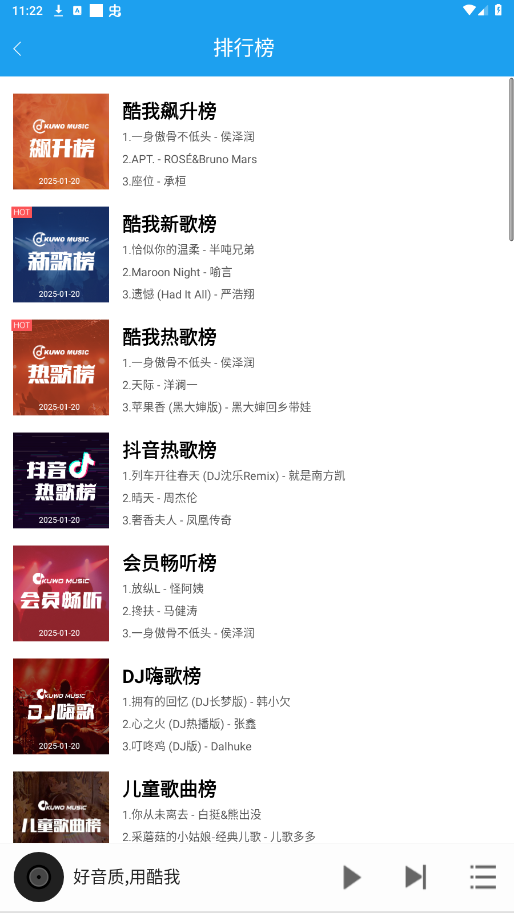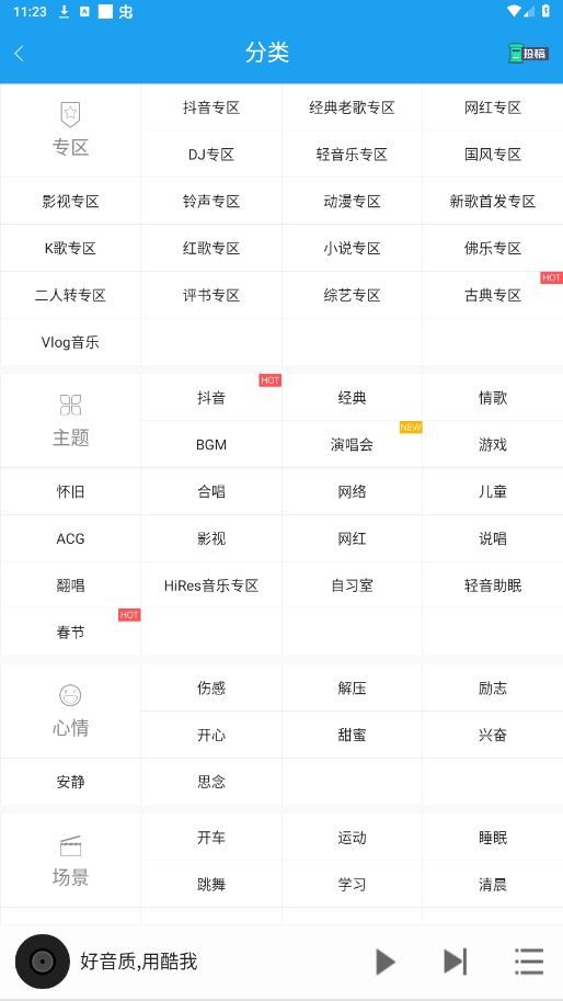 多样化的歌曲分类,MV,电台,DJ,铃声,儿歌,影视,相声小品,评书等想听什么就有什么,一切尽在酷我音乐HD版;
