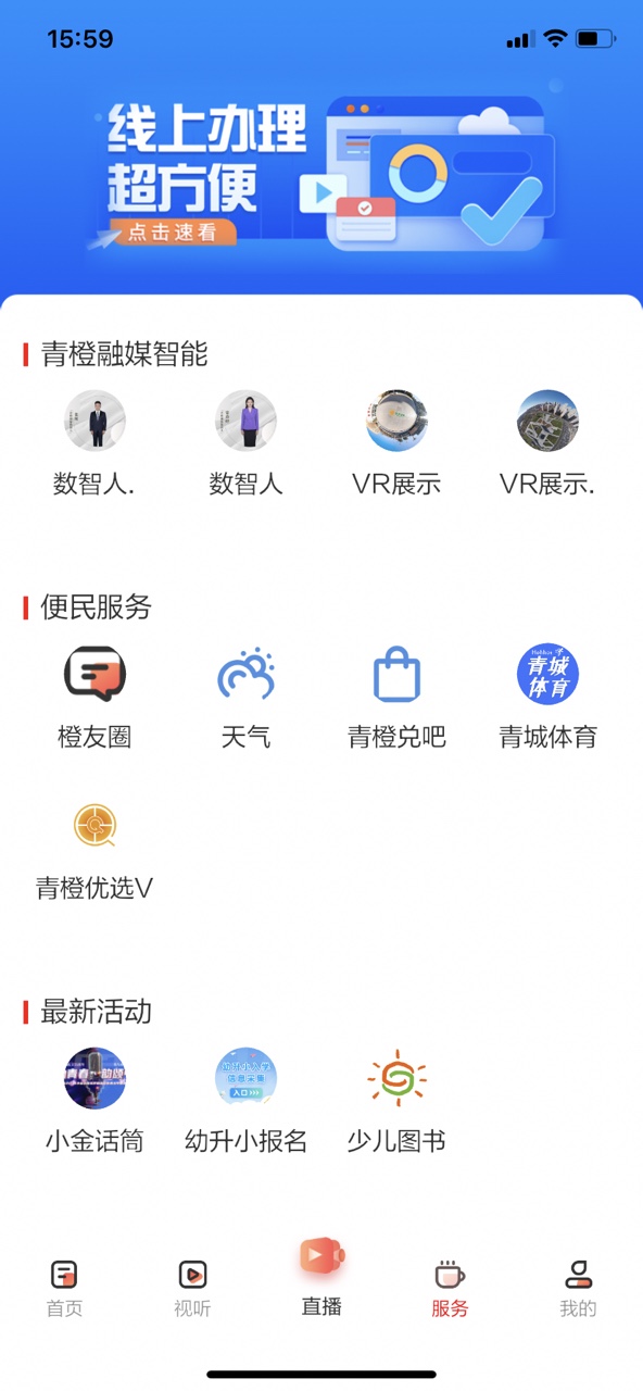 点击进入服务界面,可以查看本地天气,体育,最新活动等等