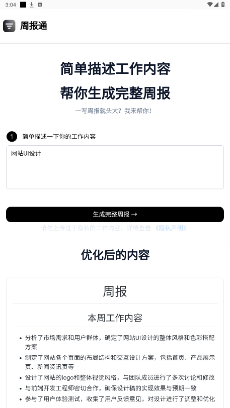 打开ai写周报工具,在输入框简单描述一下你的工作内容,比如网站UI设计